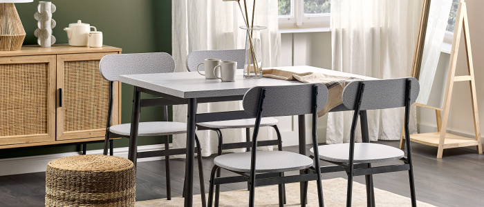 A modern grey dining table set with a sleek design and metal frame, perfect for stylish and comfortable everyday dining.